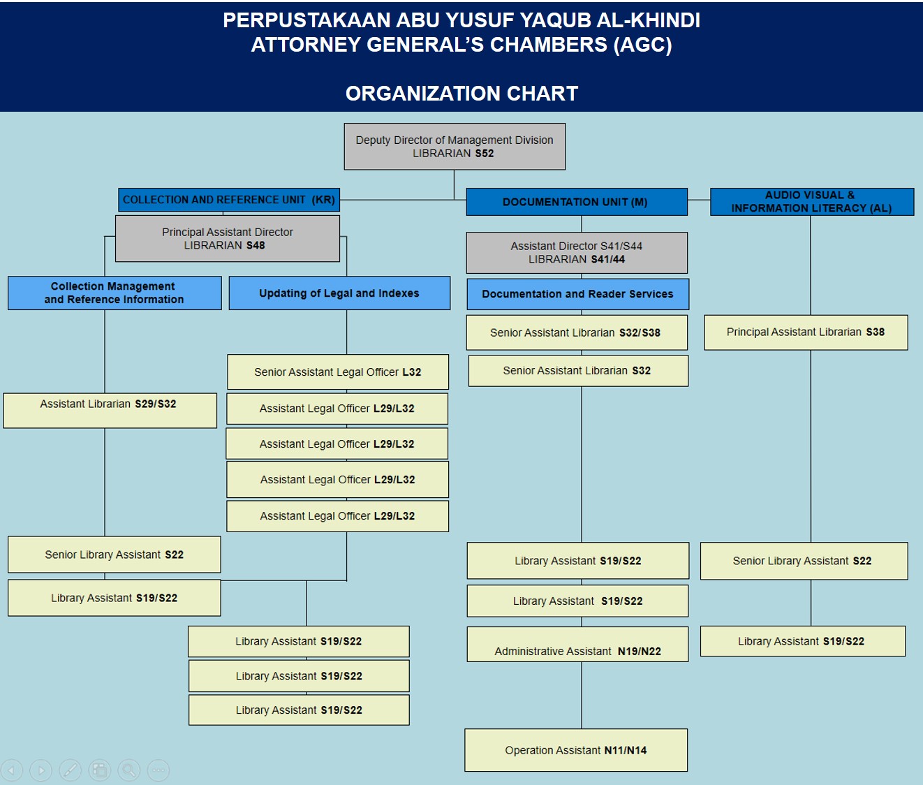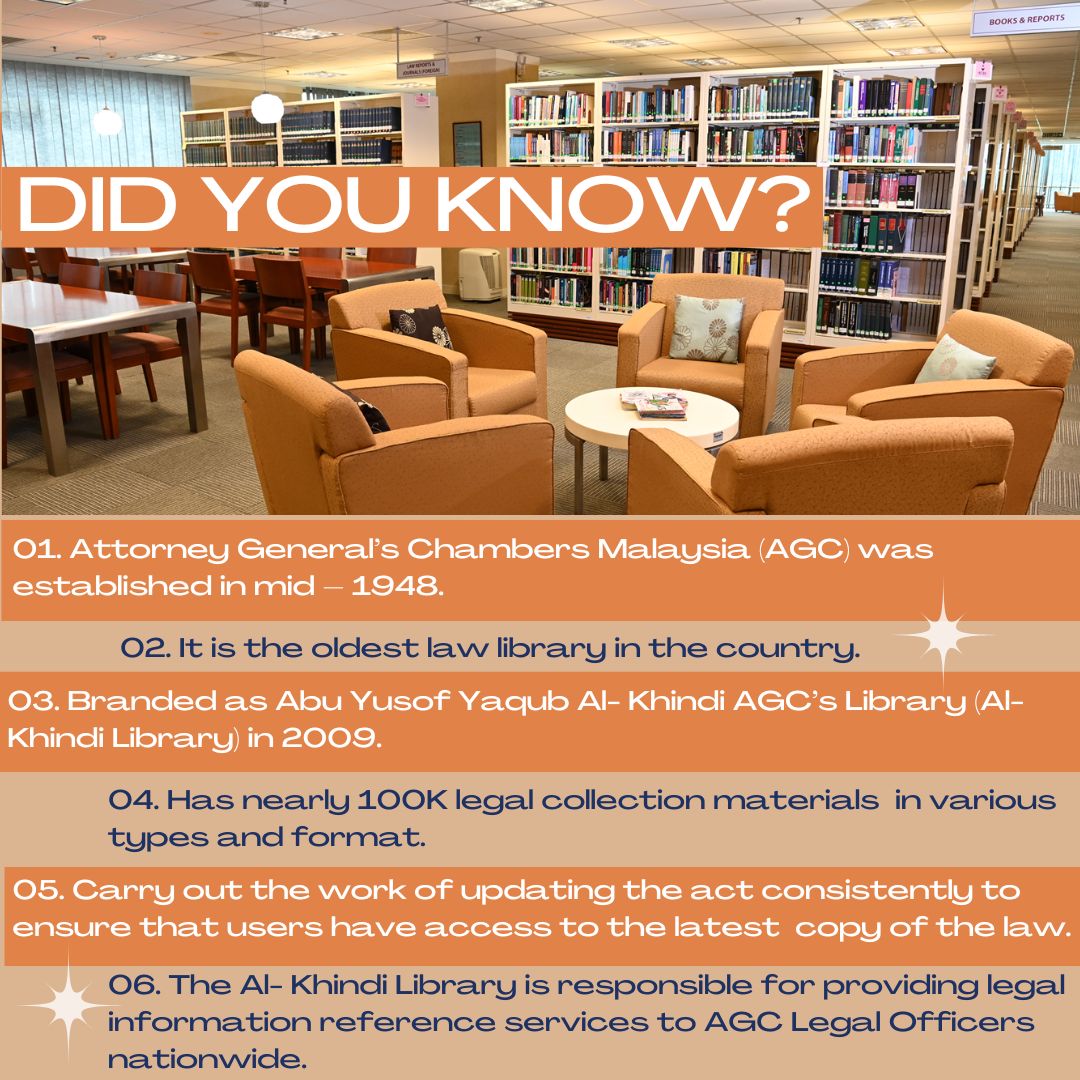 The Law Library of the Attorney General’s Chambers of Malaysia was first established in 1948 and is one of the oldest and most significant law libraries in Malaysia. Renamed Perpustakaan Abu Yusuf Yaqub Al-Khindi it is responsible for giving legal information, reference services and updating legislations and legal indexes. The library also provides collection development, preservation and digitization of legal collections, training on legal online databases and current awareness services to officers and staff members of AGC.